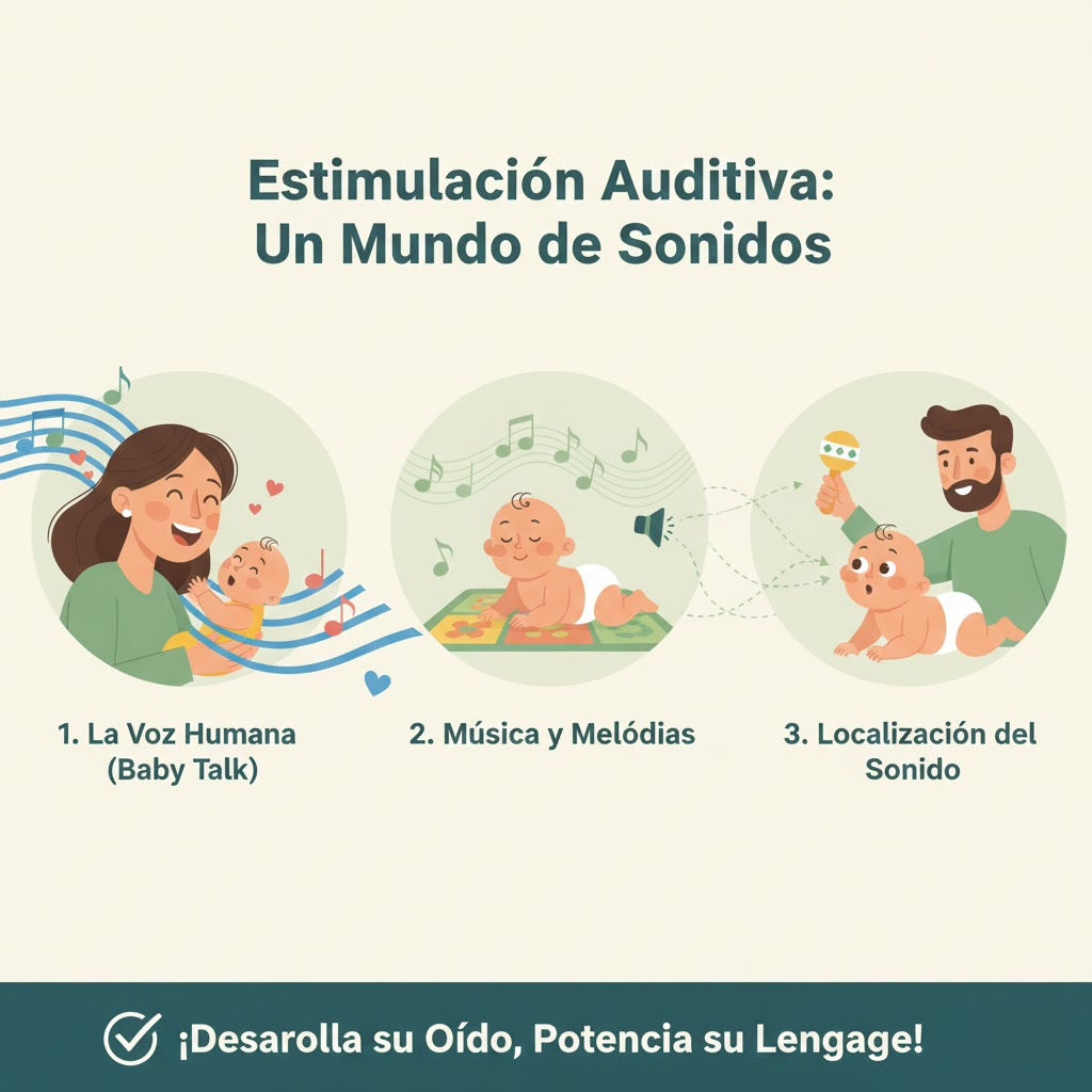 El sentido del oído está bastante desarrollado al nacer, e incluso antes. Los bebés pueden reconocer la voz de su madre desde el vientre. La estimulación auditiva es vital para el desarrollo del lenguaje, la conciencia fonológica y la memoria.