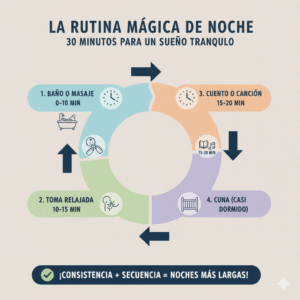 En resumen: La Rutina de Noche Mágica es el puente de la actividad a la calma. Si es consistente, corta y suave, se convierte en la señal más fuerte para que el bebé sepa que es el momento de tener un sueño prolongado.