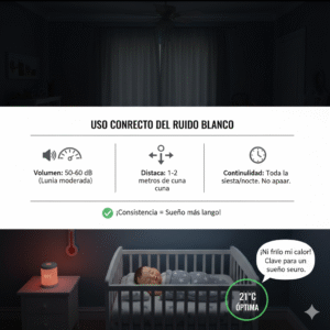 Continuidad: Déjalo encendido durante toda la duración de la siesta o toda la noche. Apagarlo a mitad de un ciclo es una señal de cambio que puede despertar al bebé.