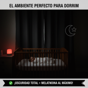 Activación de Melatonina: Como vimos en la Lección 1.2, la luz (especialmente la azul) es el principal inhibidor de la Melatonina. La oscuridad absoluta le dice al cerebro del bebé: “¡Es hora de producir Melatonina y dormir profundamente!”.