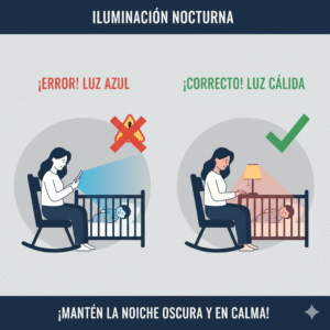 Luz Brillante: Encender las luces fuertes o revisar el teléfono (luz azul, Lección 1.2) envía una señal clara de “¡DÍA!” al cerebro del bebé.