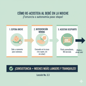 Este es el punto crucial para consolidar la autorregulación. Si tu bebé se despierta y le ofreces su asociación de sueño original (pecho, biberón, mecer), estarás deshaciendo el progreso de las Lecciones 3.1 y 3.2.