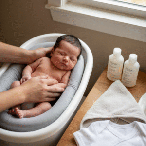 Preparación es clave: Antes de desvestir al bebé, ten todo listo y al alcance de tu mano: la tina (llena con unos 5-7 cm de agua tibia, prueba con tu codo para asegurarte de que no queme), una toalla suave, champú y jabón especial para bebé (sin lágrimas, pH neutro), algodón o gasas estériles, y ropa limpia.
